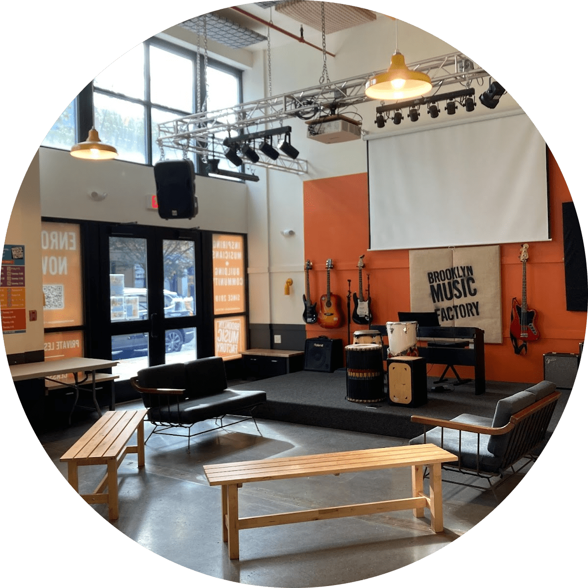We’ve got a beautiful, light-filled space to spread out and party! There’s a mainstage, room to play, and professional lights and sound.