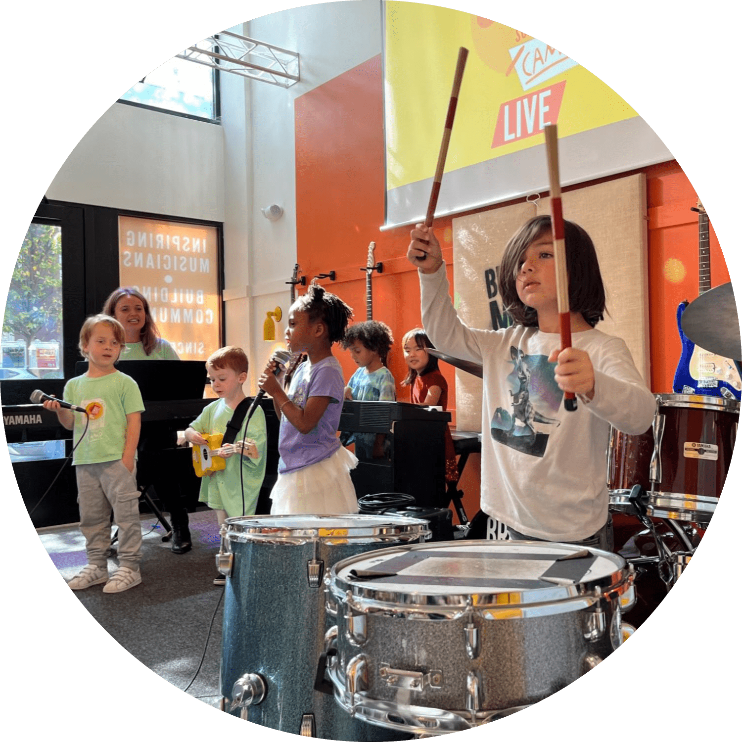 Campers play their original songs for each other at the gig on Fridays. Kids love performing together because they are building confidence and also celebrating their accomplishments. The gigs are live-streamed and recorded so families can join the fun.